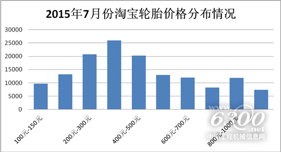 2015年7月份,线上轮胎的销售价格基本维持不变,从150元到1500元不等,而200-500元的轮胎价格区间依旧最受消费者欢迎,相较于上月变化不大。本月轮胎300-400元的成交量突破25000件大关。由此看出,平民化的价格仍然最受消费者的欢迎。