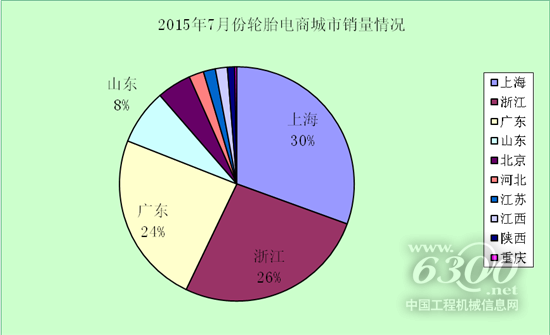 2015年7月份轮胎电商地域格局继续趋向多样化,电商领域“霸主”上海轮胎电商本月份销量回升,占30%,浙江、广东轮胎线上销量奋力直追,分别占据“26%”和“24”。其他省市如江苏、江西等地电商也发展迅猛,试图在轮胎电商市场“分多一杯羹”,由此可见未来轮胎电商的的区域竞争势必更加激烈。