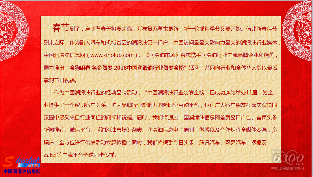 作为中国润滑油行业的经典品牌活动,“中国润滑油行业贺岁金榜”已成功连续举办11届,为企业提供了一个密切客户关系、扩大品牌行业影响力的跨时空互动平台,也让广大客户朋友在喜庆欢快的氛围中感受来自行业同仁的问候和祝福。润滑油产业链的全球知名品牌、优秀自主品牌、行业大咖、专家泰斗以及来自汽车和汽车后市场、工程机械等行业用户将通过中国润滑油信息网全球传播的“金狗闹春 名企贺岁 2018中国润滑油行业贺岁金榜”向全球华人祝福新年,向全国车主致以节日问候。