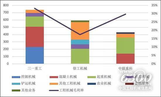 中联重科分别在起重机械和混凝土机械方面与徐工机械和三一重工形成强势对抗,此外农业机械和高空作业机械是中联重科未来的战略业务方向,目前在收入和毛利贡献方面尚未显现(农业机械板块目前毛利率仅为4.3%)。