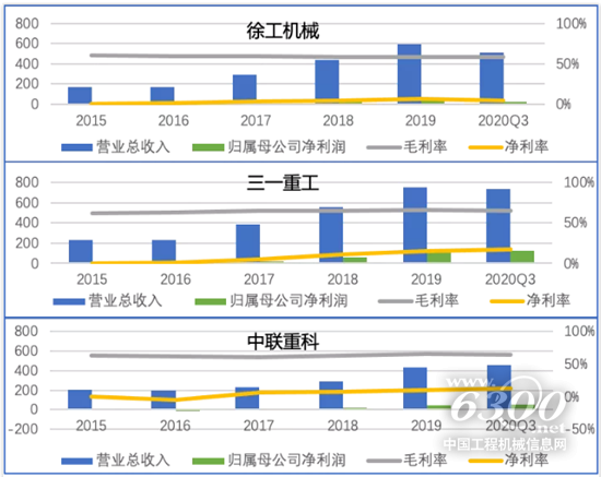 截止到2020年Q3:中联重科净利率>三一重工净利率>徐工机械净利率。