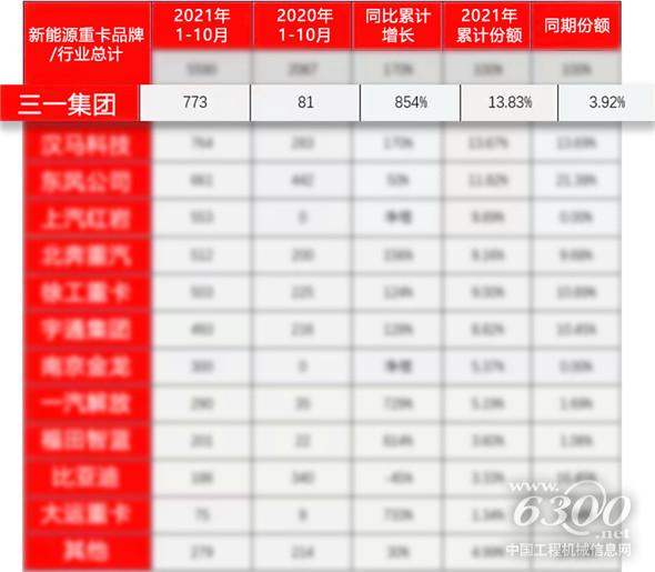 最新数据显示,今年1-10月,国内新能源重卡总销量5590台,三一新能源重卡累计销量773台,同比增长约854%,累计市占率达到13.83%,成为国内新能源重卡市场的销量冠军。
