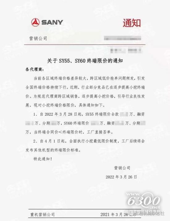 日前,三一重机营销公司发布《关于SY55、SY60终端限价的通知》。通知明确:自2022年3月28日起,关于SY55、SY60型挖掘机的终端价格,按全款、融资、分期分别给出最低限价。与此同时,《通知》明确,当终端合同价<终端限价时,工厂直接否单。