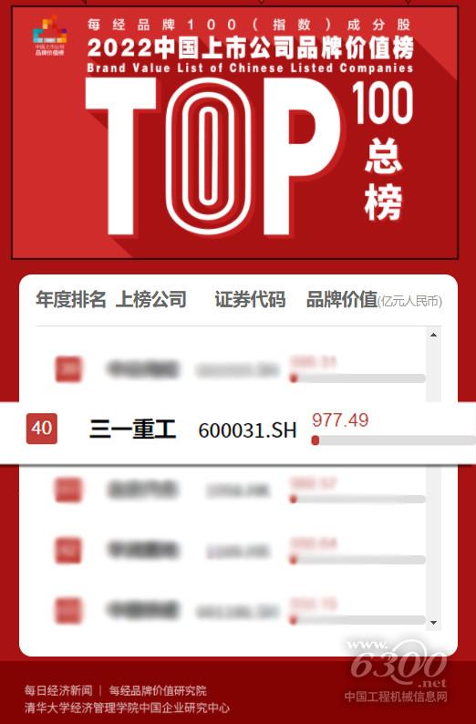 5月10日,每经品牌100(指数)上线仪式暨2022中国上市公司品牌价值榜发布会举行。会上,三一重工以977.49亿元的品牌价值,位列“2022中国上市公司品牌价值榜”总榜第40名,第4次入围中国品牌价值榜,较上年跃升19个名次,稳居工程机械行业第一。