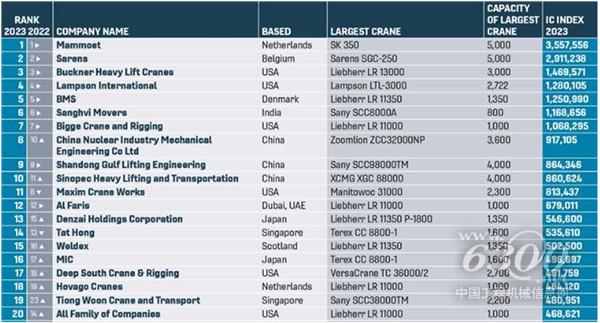 近期,2023年IC100全球起重机运营企业100强排名公布。排名前七的公司的排名与去年相同,是迄今为止世界上最大的国际重型起重和运输专家。中核机械工程有限公司排名上升了两位,取代了美国的马克西姆公司,排名第八;中国企业的山东海湾吊装工程股份有限公司保持了去年的第9名;中石化重型起重运输工程有限责任公司从第11名进入前十。