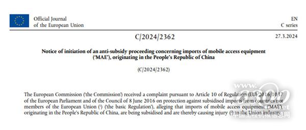 2024年3月27日,欧委会发布公告,决定对原产于中国的移动式升降作业平台整机和成套散件产品(mobile access equipment, the pre-assembled or ready-to-assemble sections of mobile access equipment)发起反补贴调查。