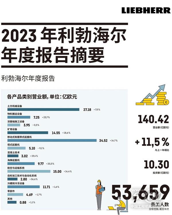 2023财年,利勃海尔营收再次创下历史新高,达到140.42亿欧元,比上年增长 11.5%。集团几乎所有产品领域的收入均得到大幅增长。2023年,利勃海尔集团实现净利润3.67亿欧元。经营业绩较2022年有所增长,财务业绩较上年水平大幅增长。