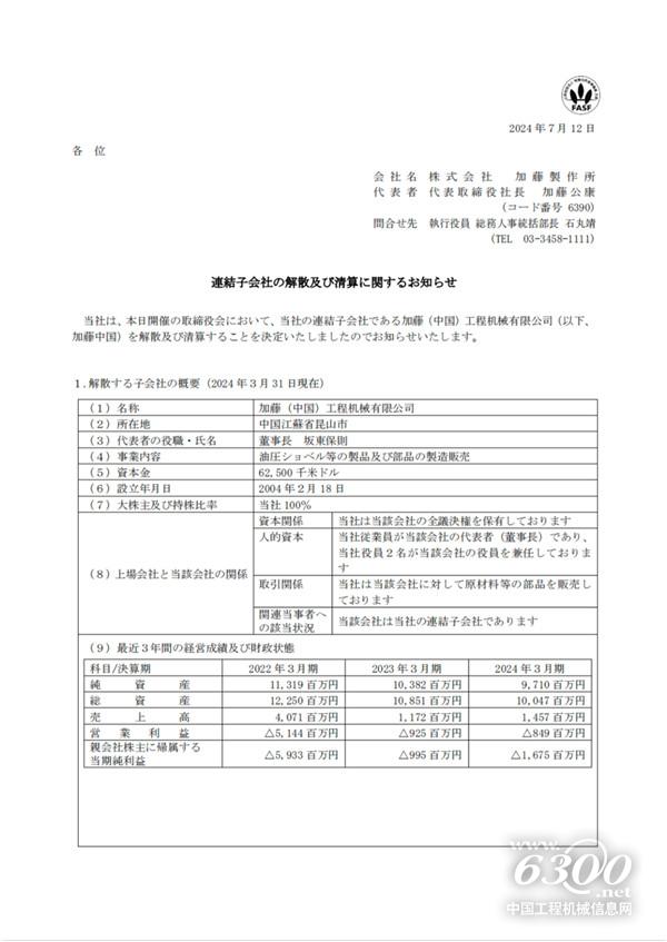 2024年7月12日,株式会社加藤制作所在官网宣布了关于加藤(中国)工程机械有限公司(简称“加藤中国”)解散并清算的决定,意味着加藤彻底退出中国市场。在加藤中国以及加藤中骏解散后,加藤制作所将在中国设立一个新的办事处,来维持和应对在中国市场的产品售后服务。对于两家子公司清算对总公司合并业绩的影响,目前尚未确定。