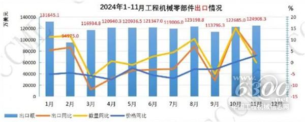 1—11月,工程机械零部件累计出口额131亿美元,同比增速-0.46%。整个出口额呈现震荡下降的态势。其中,零部件11月出口额为12.49亿美元,同比增长3.01%左右。从出口销量及价格来看,零部件整体出口表现为“量价齐跌”。